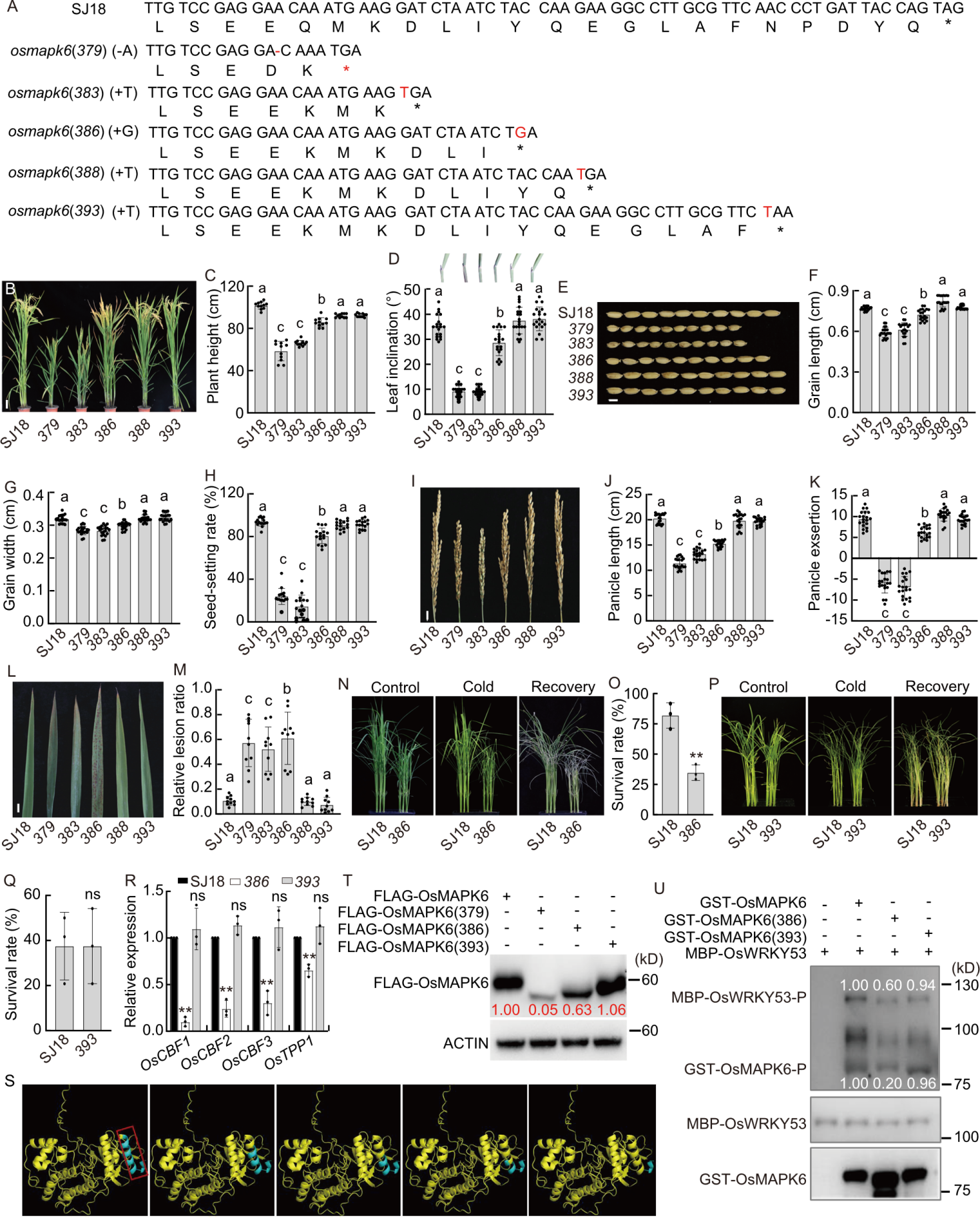 Fig. 1. Effects of varying C-terminal truncation lengths in OsMAPK6 on rice growth, development, and stress responses. A, Schematic representation of C-terminal coding sequences and corresponding protein sequences of OsMAPK6 in Suijing 18 (SJ18, wild type), osmapk6(379), osmapk6(383), osmapk6(386), osmapk6(388), and osmapk6(393). The asterisk (*) indicates a stop codon; the dash (-) represents a deletion; red letters highlight inserted nucleotides. B, Gross morphology of SJ18, osmapk6(379), osmapk6(383), osmapk6(386), osmapk6(388), and osmapk6(393) at the heading stage. Scale bar, 10 cm. C and D, Plant height (C) and flag leaf lamina joint morphology and angle quantification (D) of SJ18, osmapk6(379), osmapk6(383), osmapk6(386), osmapk6(388), and osmapk6(393) at the maturity stage. E, Grain phenotype of SJ18, osmapk6(379), osmapk6(383), osmapk6(386), osmapk6(388), and osmapk6(393) at the maturity stage. Scale bar, 5 mm. F and G, Quantification of grain length (F) and grain width (G) from E. H, Seed-setting rate of SJ18, osmapk6(379), osmapk6(383), osmapk6(386), osmapk6(388), and osmapk6(393) at the maturity stage. I, Panicle morphology of SJ18, osmapk6(379), osmapk6(383), osmapk6(386), osmapk6(388), and osmapk6(393) at the maturity stage. Scale bar, 1 cm. J, Statistical analysis of panicle length based on I. K, Statistical analysis of panicle exsertion in SJ18, osmapk6(379), osmapk6(383), osmapk6(386), osmapk6(388), and osmapk6(393) at the maturity stage. L, Constitutive cell death lesions observed in SJ18, osmapk6(379), osmapk6(383), osmapk6(386), osmapk6(388), and osmapk6(393) at the heading stage. Scale bar, 1 cm. M, Relative lesion ratio quantified from L. N, Plant morphology of 2-week-old SJ18 and osmapk6(386) seedlings before treatment, after exposure to 4 ºC for 2 d, and following a 5-day recovery period. Experiments were repeated at least 3 times, with 24 independent seedlings per replicate. O, Survival rate of SJ18 and osmapk6(386) after 4 ºC treatment shown in N. P, Plant morphology of 2-week-old SJ18 and osmapk6(393) seedlings before treatment, after exposure to 4 ºC for 3 d, and following a 5-day recovery period. Experiments were repeated at least 3 times, with 24 independent seedlings per replicate. Q, Survival rate of SJ18 and osmapk6(393) after the 4 ºC treatment shown in P. R, Relative expression levels of OsCBF1, OsCBF2, OsCBF3, and OsTPP1 in leaves of 2-week-old SJ18, osmapk6(386), and osmapk6(393) plants, with ubiquitin as the internal reference. Expression in SJ18 was normalized to 1.0. Data are mean ± SD (n = 3). S, AlphaFold3-predicted structure of OsMAPK6, with the terminal α-helix highlighted by a red box. From left to right, the blue regions indicate predicted structural deletions in OsMAPK6(379), OsMAPK6(383), OsMAPK6(386), OsMAPK6(388), and OsMAPK6(393). T, Protein expression of FLAG-tagged OsMAPK6, OsMAPK6(379), OsMAPK6(386), and OsMAPK6(393) in rice protoplasts. Top: Western blot detected with anti-FLAG antibody. Bottom: Western blot detected with anti-ACTIN antibody. The numbers represent the relative ratio of FLAG-OsMAPK6 to ACTIN. U, In vitro phosphorylation of MBP-OsWRKY53 by GST-OsMAPK6, GST-OsMAPK6(386), and GST-OsMAPK6(393). Top, middle, and bottom panels correspond to western blots detected with Phos-tag Biotin BTL-104, anti-MBP antibody, and anti-GST antibody, respectively. The numbers represent the relative ratios of phosphorylated MBP-OsWRKY53-P to MBP-OsWRKY53 and phosphorylated GST-OsMAPK6-P to GST-OsMAPK6, respectively. In B‒R, 379 represents osmapk6(379), 383 represents osmapk6(383), 386 represents osmapk6(386), 388 represents osmapk6(388), 393 represents osmapk6(393). Each dot represents one biological replicate. Data are mean ± SE (n = 20 in C, D, F‒H, J, K, and M, and 3 in O and Q). Different lowercase letters above bars denote significant differences (P < 0.05, one-way ANOVA followed by Tukey’s test), and the asterisks indicate significant differences compared with SJ18 (**, P < 0.01, Student’s t-test).