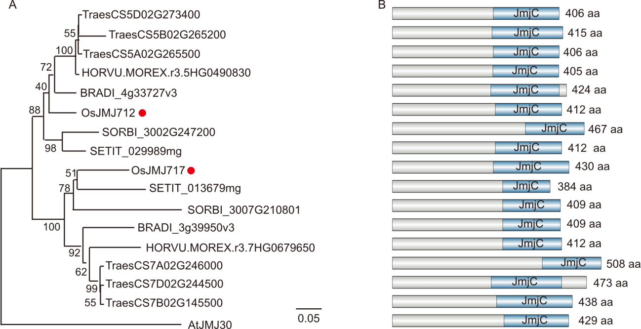 Fig. 1. Phylogenetic tree and protein structure of JMJ30 in selected monocotyledons and Arabidopsis. A, Phylogenetic analysis of JMJ30 proteins from wheat (Triticum aestivum), barley (Hordeum vulgare), purple false brome (Brachypodium distachyon), rice (Oryza sativa), sorghum (Sorghum bicolor), foxtail millet (Setaria italica), and Arabidopsis (Arabidopsis thaliana). The phylogenetic tree was constructed using the neighbor-joining method based on JMJ30 protein sequences, with 1 000 bootstrap replicates in MEGA11. The values at the nodes indicate the percentage of the bootstrap confidence level. B, Protein domain architecture of JMJ30 in different species. Gray boxes represent variable regions, while blue boxes denote conserved JmjC domains.