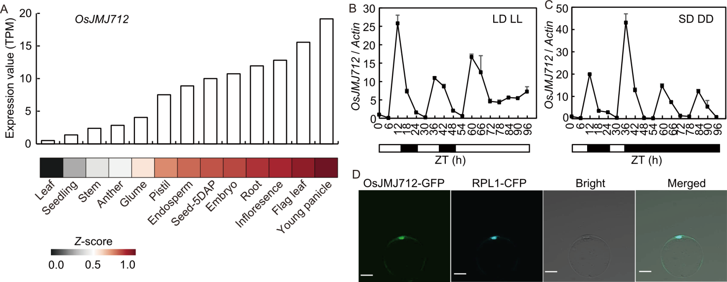 Fig. 2. Expression pattern and subcellular localization of OsJMJ712. A, Expression levels of OsJMJ712 in various rice tissues. The bar chart display expression values, and the heatmap shows gene expression as transcripts per million (TPM) values normalized by Z-score transformation. RNA-seq data were obtained from the Rice Genome Annotation Project database (RGAP, https://rice.uga.edu/expression.shtml). Transcript abundances were quantified as TPM. DAP, Days after pollination. B and C, Rhythmic expression patterns of OsJMJ712 under long-day (LD) transferred to constant light (LL) (B) and short-day (SD) transferred to constant dark (DD) (C) conditions. Fourteen-day-old seedlings grown under LD or SD conditions were transferred to LL or DD, respectively. Samples were collected every 6 h. The Actin gene was used as an internal control. Data are mean ± SD (n = 3). Black bars represent the dark period and light bars indicate the light period. ZT, Zeitgeber time; ZT0 is defined as the time of lights on. D, Subcellular localization of OsJMJ712-GFP. 35S:OsJMJ712-GFP was transformed into rice protoplasts and visualized by fluorescence microscopy. 35S:RPL1-CFP was used as a nuclear marker. Bright-field and merged images are shown. Scale bars, 10 μm. GFP, Green fluorescent protein; CFP, Cyan fluorescent protein.
