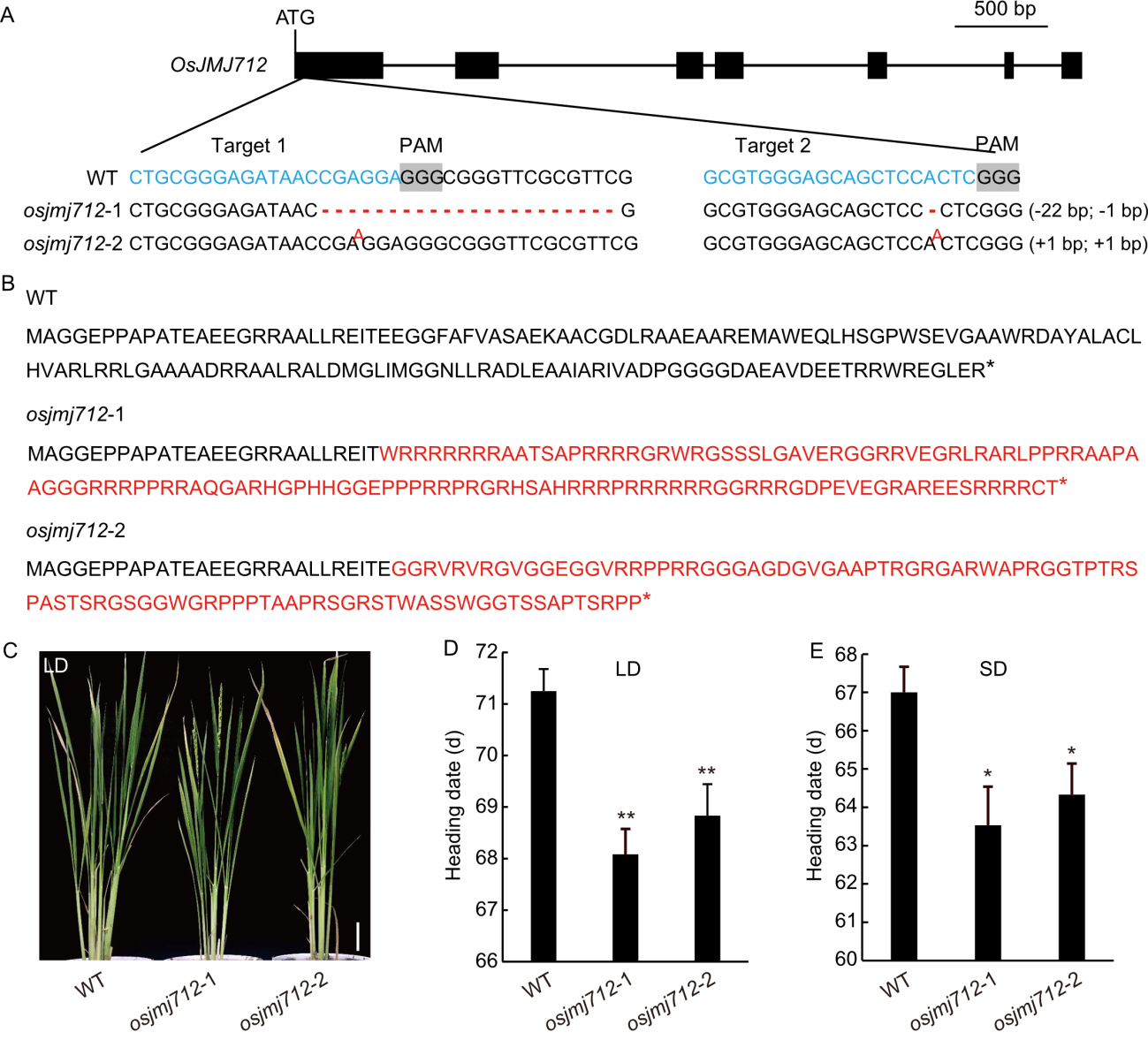 Fig. 3. Generation of OsJMJ712 gene-editing mutants and their heading date phenotypes under long-day (LD) and short-day (SD) conditions. A, Schematic of OsJMJ712 gene structure and CRISPR/Cas9-targeted mutation sites. sgRNA targets and protospacer adjacent motif (PAM) sequences are highlighted in blue and gray shading in the wild type (WT), respectively. Red nucleotides indicate insertions; red dashes indicate deletions. Sequence gap lengths are shown in parentheses. B, Partial amino acid sequences of WT and osjmj712 mutants. Red letters highlight predicted altered amino acids. Asterisks (*) indicate stop codons. C, Flowering phenotype of WT and osjmj712 mutants under LD conditions. Scale bar, 10 cm. D and E, Statistical analysis of heading date for WT and osjmj712 mutants under LD (D) and SD (E) conditions. Data are mean ± SD (n = 12). Significant differences were determined by a two-tailed unpaired Student’s t-test (*, P ≤ 0.05; **, P ≤ 0.01).