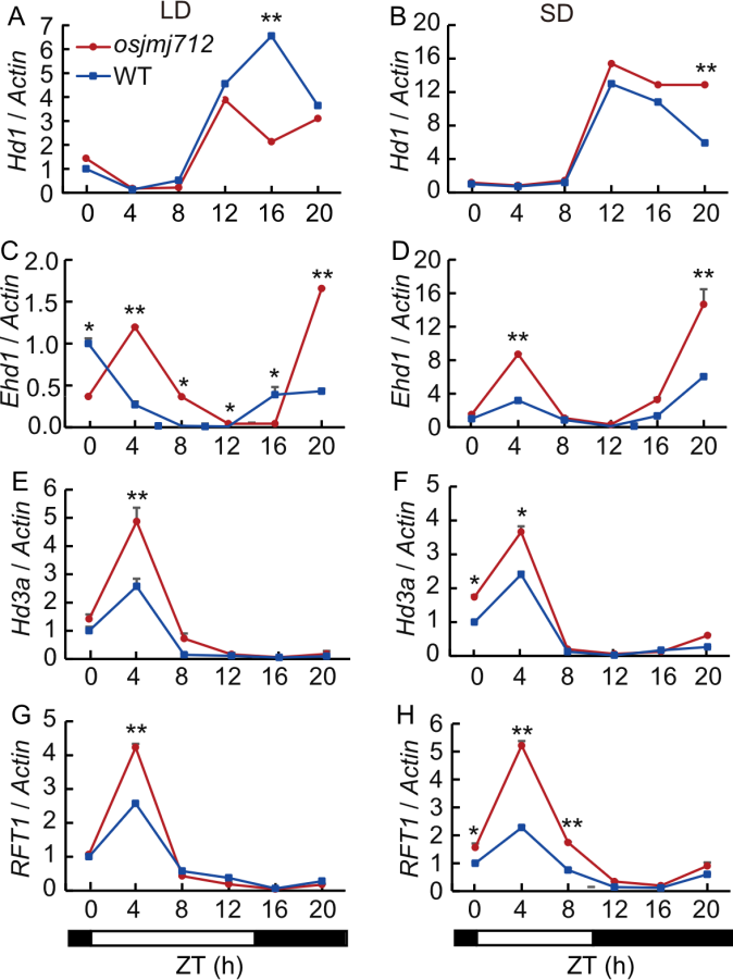Fig. 4. Diurnal expression patterns of key flowering-related genes in wild type (WT) and osjmj712 mutants under long-day (LD) and short-day (SD) conditions. Black bars represent the dark period and light bars indicate the light period. ZT, Zeitgeber time; ZT0 is defined as the time of lights on. The Actin gene was used as an internal control. Data are mean ± SD (n = 3). Significant differences were determined by a two-tailed unpaired Student’s t-test (*, P ≤ 0.05; **, P ≤ 0.01).