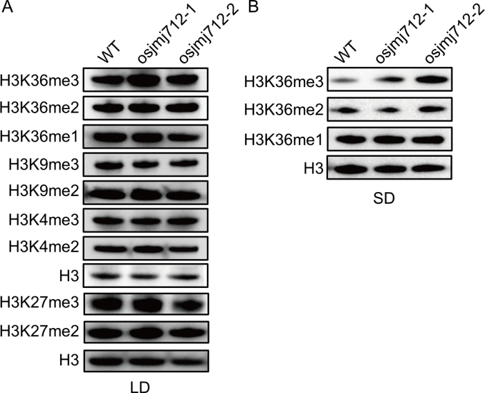 Fig. 5. OsJMJ712 is an H3K36me3 demethylase. Assay of histone H3 lysine methylation levels in vivo. Western blot analysis of histones isolated from wild type (WT) and osjmj712 mutants under long-day (LD, A) and short-day (SD, B) conditions using the indicated methylation-specific antibodies listed on the left. Anti-H3 was used as a loading control.