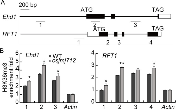 Fig. 6. H3K36me3 levels at Ehd1 and RFT1 loci in osjmj712 mutant and wild type (WT). A, Schematic diagrams of Ehd1 and RFT1 gene structures and the fragments detected by chromatin immunoprecipitation-quantitative PCR (ChIP-qPCR). Numbers 1‒4 represent the regions analyzed. B, ChIP-qPCR analysis of H3K36me3 enrichment at the Ehd1 and RFT1 loci. The Actin gene was used as an internal control for normalization. Numbers 1‒4 represent regions 1‒4 in A. IgG was used as a negative control. Data are mean ± SD (n = 3). Asterisks indicate significant differences between osjmj712 mutant and WT (Student’s t-test, *, P ≤ 0.05; **, P ≤ 0.01).