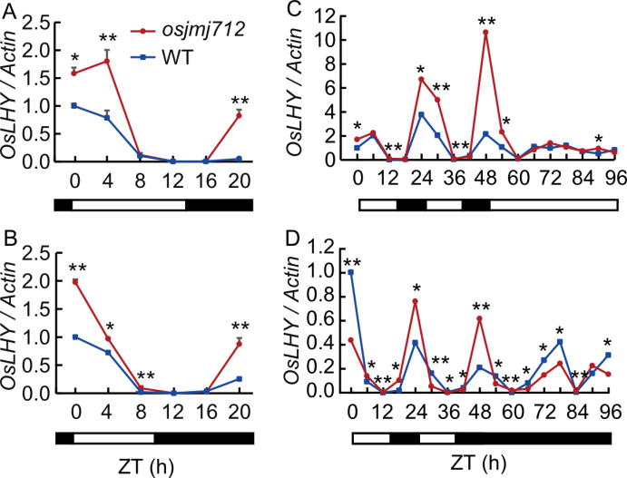 Fig. 7. Rhythmic expression of OsLHY in osjmj712 mutant and wild type (WT). A and B, Diurnal expression patterns of OsLHY in WT and osjmj712 mutant under long-day (LD, A) and short-day (SD, B) conditions. C and D, Free-running rhythms of OsLHY expression in WT and osjmj712 mutant under constant light (LL, C) and dark (DD, D) conditions. Black bars represent the dark period and light bars indicate the light period. ZT, Zeitgeber time; ZT0 is defined as the time of lights on. The Actin gene was used as an internal control. Data are mean ± SD (n = 3). Significant differences were determined by a two-tailed unpaired Student’s t-test (*, P ≤ 0.05; **, P ≤ 0.01).