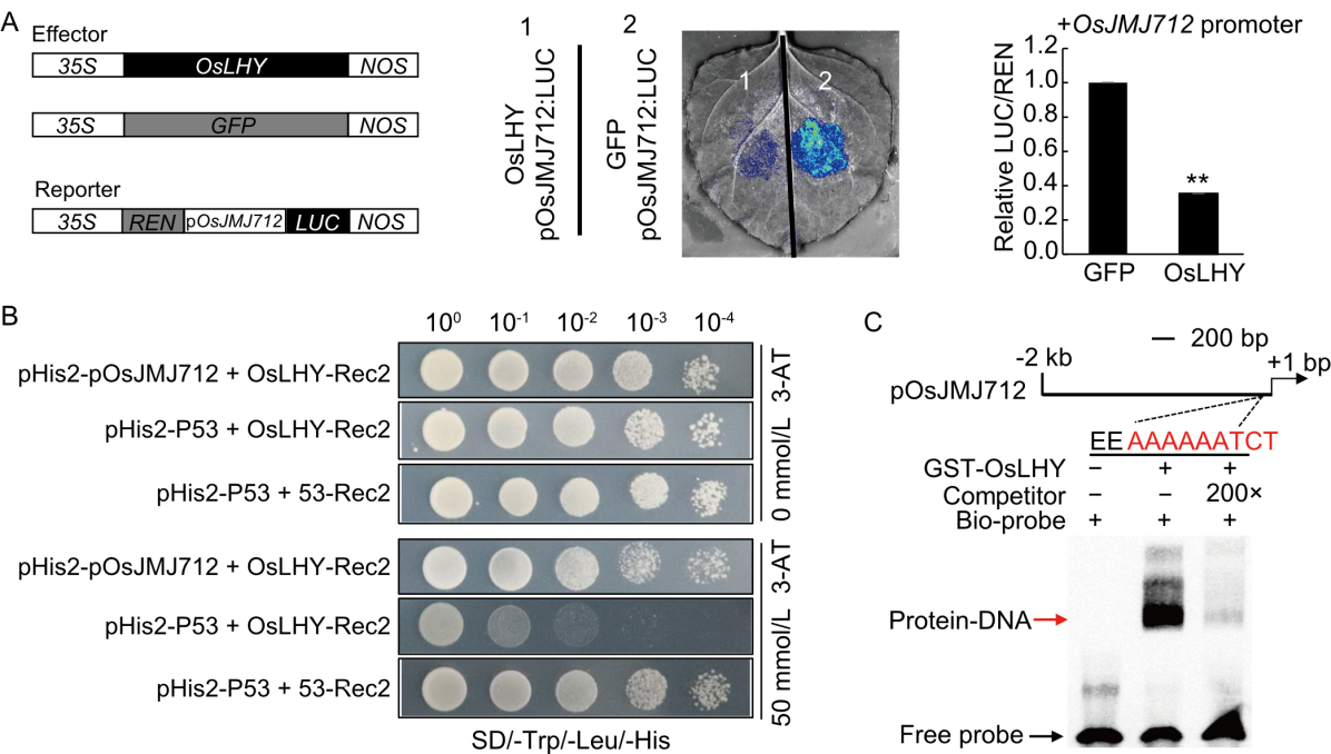 Fig. 8. OsLHY directly binds to OsJMJ712 promoter. A, Transcriptional activity of the OsJMJ712 promoter was assessed by dual-luciferase assays in Nicotiana benthamiana leaves. REN, Renilla luciferase; LUC, Firefly luciferase. Data are mean ± SD (n = 5). Significant differences were determined by Student’s t-test (**, P ≤ 0.01). B, Interaction between OsLHY and OsJMJ712 promoter detected by yeast one-hybrid (Y1H) assays. pHis2‐pOsJMJ712 and OsLHY‐Rec2 were co-transformed into yeast cells, and transformants were grown on SD/‐Trp/‐Leu/‐His (SD/-TLH) medium and SD/‐TLH medium supplemented with 50 mmol/L 3‐amino‐1,2,4‐triazole (3‐AT). C, Binding of OsLHY to evening element (EE) sequences in OsJMJ712 promoter detected by electrophoretic mobility shift assay (EMSA). EE fragments were 5ʹ-biotin-labelled as the Bio‐probe. Unlabelled probe was used as competitor. Purified GST‐OsLHY fusion protein was incubated with the designed probes. The red arrowhead indicates the protein‐DNA complex, and the black arrowhead indicates the free probe.