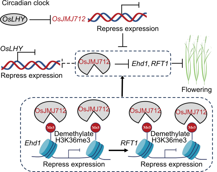 Fig. 9. Proposed model for the role of OsJMJ712 in regulating flowering in rice. OsJMJ712 is a component of the circadian clock, and its expression is directly suppressed by OsLHY. Loss of function of OsJMJ712 increases OsLHY expression, indicating a potential negative transcriptional feedback loop. Acting as an H3K36me3 demethylase, OsJMJ712 removes H3K36me3 marks at the Ehd1 and RFT1 loci, thereby repressing their transcription and ultimately delaying flowering.