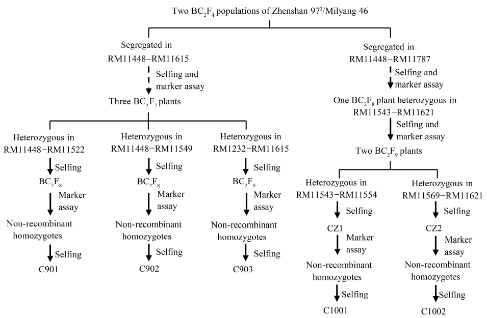| BC2F10:11 | C1001 | RM11543-RM11554 | 30 lines for ZS97, 30 lines for MY46 | April-August, 2013 |
