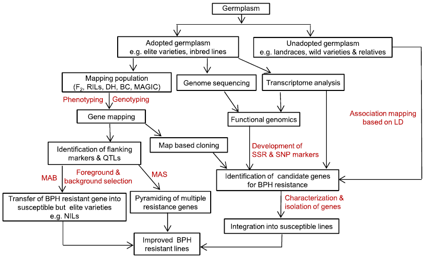 Fig. 1. Flowchart indicating use of molecular breeding and genomics method for developing brown planthopper (BPH) resistant rice lines.BC, Backcross; DH, Double haploid; LD, Linkage disequilibrium; MAB, Marker-assisted breeding; MAS, Marker-assisted selection; MAGIC, Multi-parental advanced generation intercross; NILs, Near isogenic lines; QTLs, Quantitative trait loci; RILs, Recombinant inbred lines; SNP, Single nucleotide polymorphism; SSR, Simple sequence repeat.