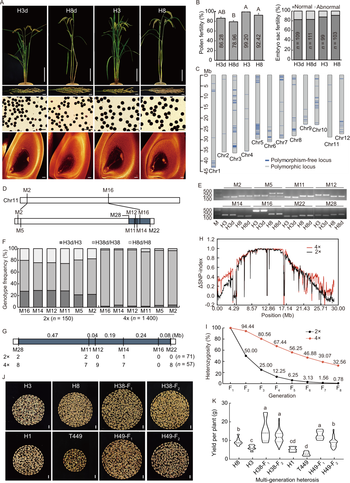 Fig. 1. Genetic analysis and multi-generation heterosis assessment in neo-tetraploid rice. A, Plant type (scale bars, 20 cm), panicles (scale bars, 2 cm), pollen grains stained with 1% I2-KI solution (scale bars, 100 μm), and mature embryo sacs (scale bars, 40 μm) of H3d, H8d, H3, and H8. B, Pollen fertility and embryo sac fertility of H3d, H8d, H3, and H8. C, Distribution of polymorphic loci on 12 rice chromosomes (Chr). D, Location of molecular markers (M2, M5, M11, M12, M14, M16, M22, and M28) on chromosome 11. E, Genotyping of H3, H3d, H8, and H8d using molecular markers. ‘M’ indicates DNA marker; M2, M5, M11, M12, M14, M16, M22, and M28 denote polymorphic molecular markers. F‒H, Distributions of molecular marker genotypes (F), recombinant individuals relative to marker M16 (G), and ΔSNP-index on chromosome 11 (H) in diploid (2×) and tetraploid (4×) F2 populations. I, Heterozygote frequencies in 2× and 4× populations from F1 to F8 generations. J and K, Multi-generation heterosis assessment of grain yield per plant in tetraploid hybrids and their parental lines (n ≥ 3). ‘H38’ and ‘H49’ indicate the offspring of H3 × H8 and T449 × H1, respectively. ‘n’ indicates the total number of samples observed in B and G. Different letters above bars in B and K indicate significant differences (uppercase letters: α = 0.01; lowercase letters: α = 0.05; one-way analysis of variance with least significant difference test).