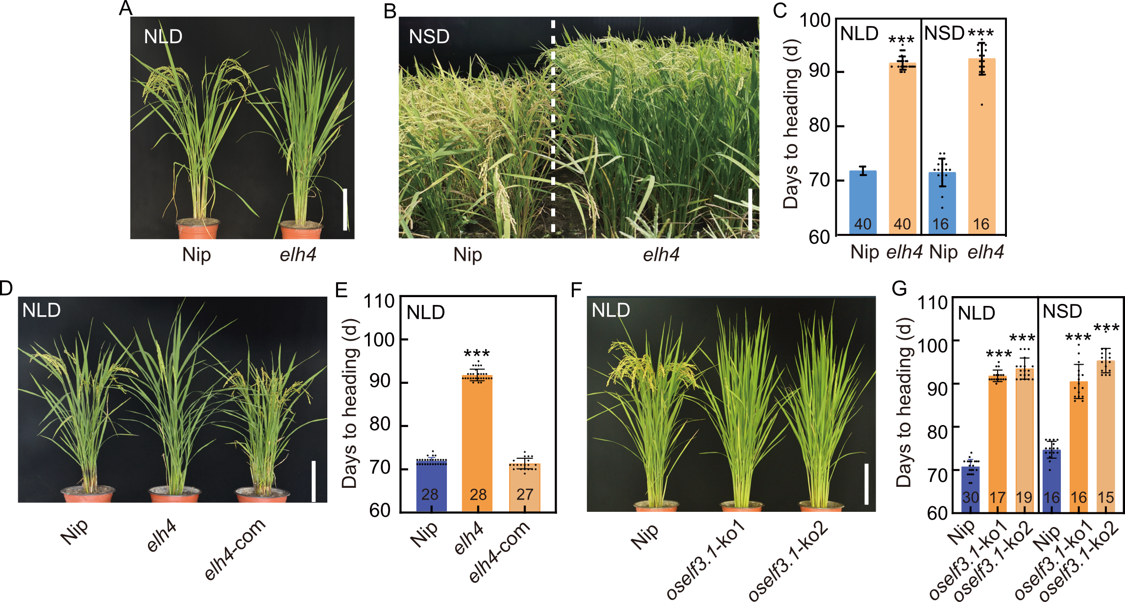 Fig. 1. Role of OsELF3.1 in rice heading. A and B, Phenotypes of Nipponbare (Nip, wild type) and elh4 mutant under natural long-day (NLD) conditions in Hangzhou, Zhejiang Province, China (A), and natural short-day (NSD) conditions in Lingshui, Hainan Province, China (B). Scale bar in A and B are 20 and 30 cm, respectively. C, Days to heading comparisons for Nip and elh4 under NLD and NSD conditions. D and E, Phenotypic analysis of Nip, elh4, and elh4 complementation (elh4-com) lines under NLD conditions (D) and corresponding heading date statistics (E). Scale bar in D is 20 cm. F and G, Phenotypic identification (F) and heading date statistics (G) for oself3.1 knockout lines (oself3.1-ko1 and oself3.1-ko2) under NLD and NSD conditions. Scale bar in F is 20 cm. In C, E, and G, data are mean ± SD (n values shown in columns). *** above bars indicate statistically significant differences at the 0.001 level by Student’s t test.
