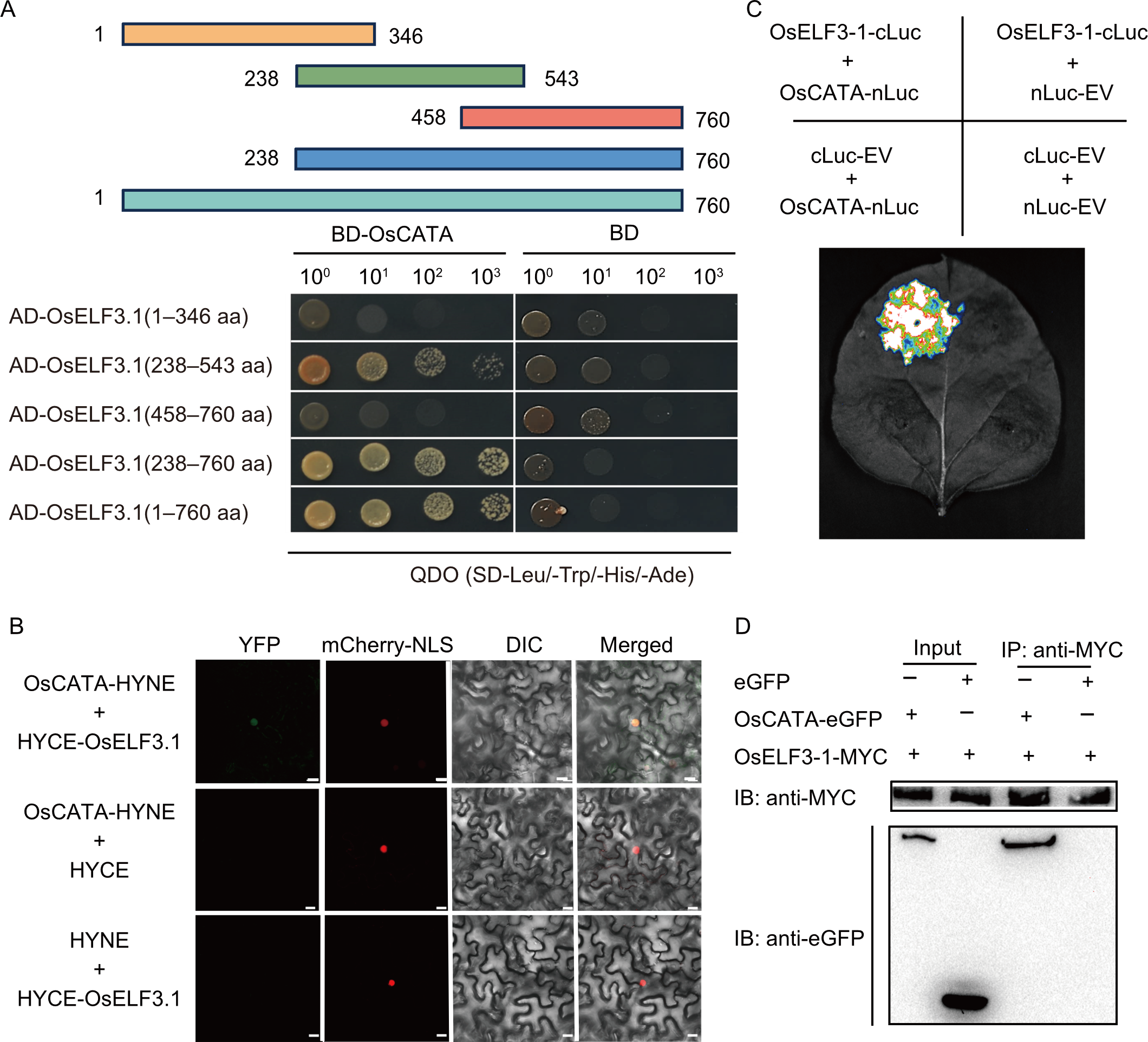 Fig. 2. Interaction between OsELF3.1 and OsCATA. A, Yeast two-hybrid (Y2H) assays reveal interactions between OsELF3.1 and OsCATA. OsELF3.1 and its truncated fragments served as prey against bait constructs, with co-transformed Y2H Gold yeast cells assessed on QDO (SD-Leu/-Trp/-His/-Ade) media. AD, GAL4 activation domain; BD, GAL4 DNA-binding domain. B, Bimolecular fluorescence complementation (BiFC) assays validate the interaction. Constructs were agroinfiltrated into Nicotiana benthamiana, and fluorescence signals were detected 4 d post-infiltration using a confocal microscope (Zeiss 700). mCherry-NLS served as a nuclear marker. Scale bars, 20 µm. YFP, Yellow fluorescent protein; DIC, Differential interference contrast. C, Luminescence complementation imaging (LCI) assays confirm the interaction of OsELF3.1 with OsCATA. Constructs were transiently expressed in N. benthamiana, with nLuc and cLuc as negative controls. Luminescence was visualized using a low-light, cooled charge-coupled device (CCD) camera. cLuc, C-terminal fragment of luciferase; nLuc, N-terminal fragment of luciferase; EV, Empty vector. D, Co-immunoprecipitation (Co-IP) assays demonstrate interaction in rice protoplasts co-transfected with OsELF3.1 and OsCATA. Immunoprecipitation was performed with anti-MYC sepharose beads, and proteins were detected using anti-GFP and anti-MYC antibodies.