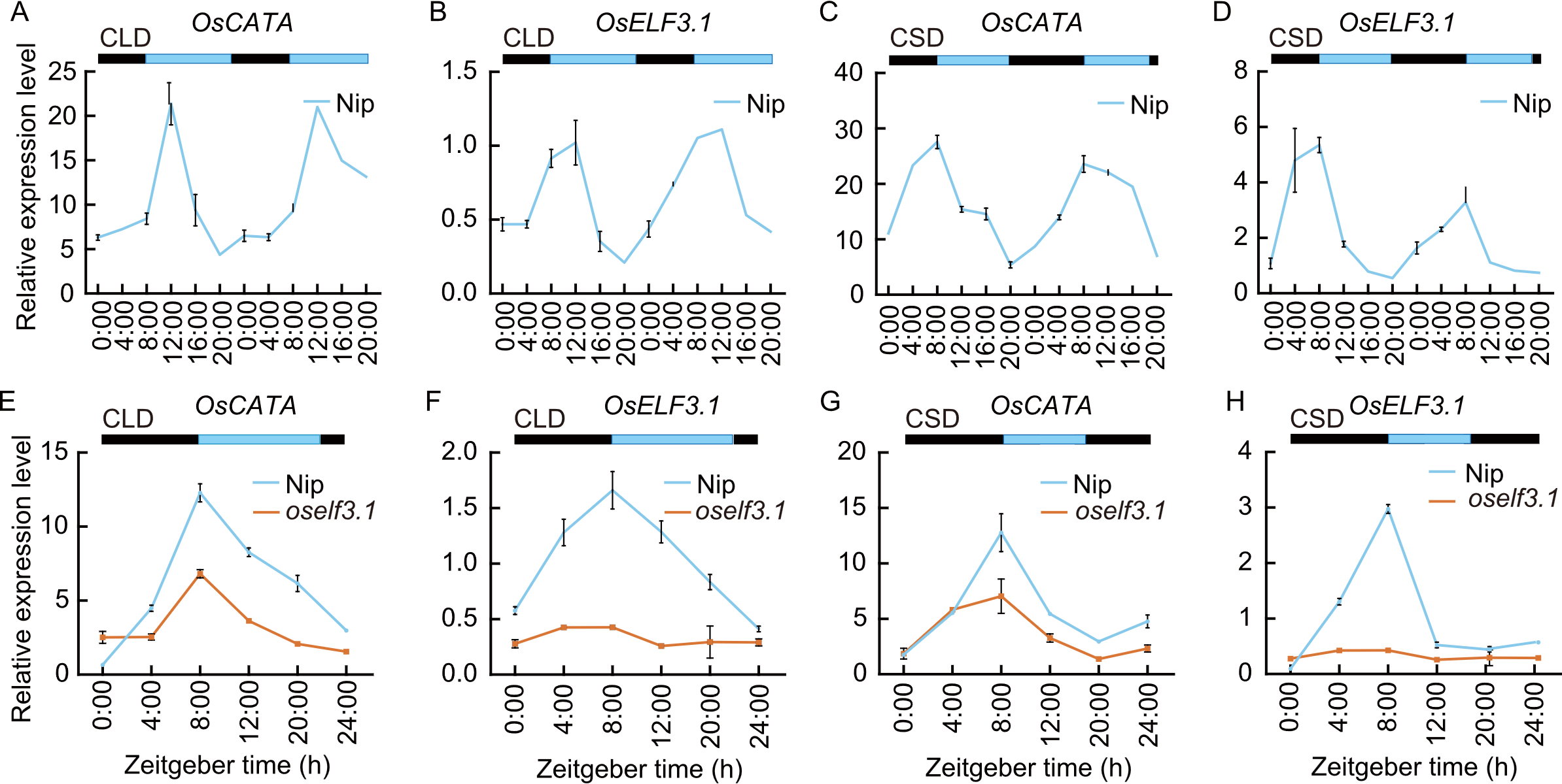 Fig. 4. Diurnal expression patterns of OsCATA and OsELF3.1. A-D, qRT-PCR analysis of OsCATA and OsELF3.1 in leaves of Nipponbare (Nip) plants under controlled long-day (CLD, A and B) and controlled short-day (CSD, C and D) conditions. E-H, Expression profiles of OsCATA and OsELF3.1 in leaves of Nip and oself3.1 plants under CLD (E and F) and CSD (G and H). Leaf samples were collected at 50 d after sowing in CLD (A, B, E, and F) and 40 d after sowing in CSD (C, D, G, and H) conditions. Transcript levels were normalized to ubiquitin (Os03g0234350), with data as mean ± SD (n = 3). Zeitgeber time (ZT) defines light onset (ZT8). Light and dark periods are represented by blue and black bars, respectively.