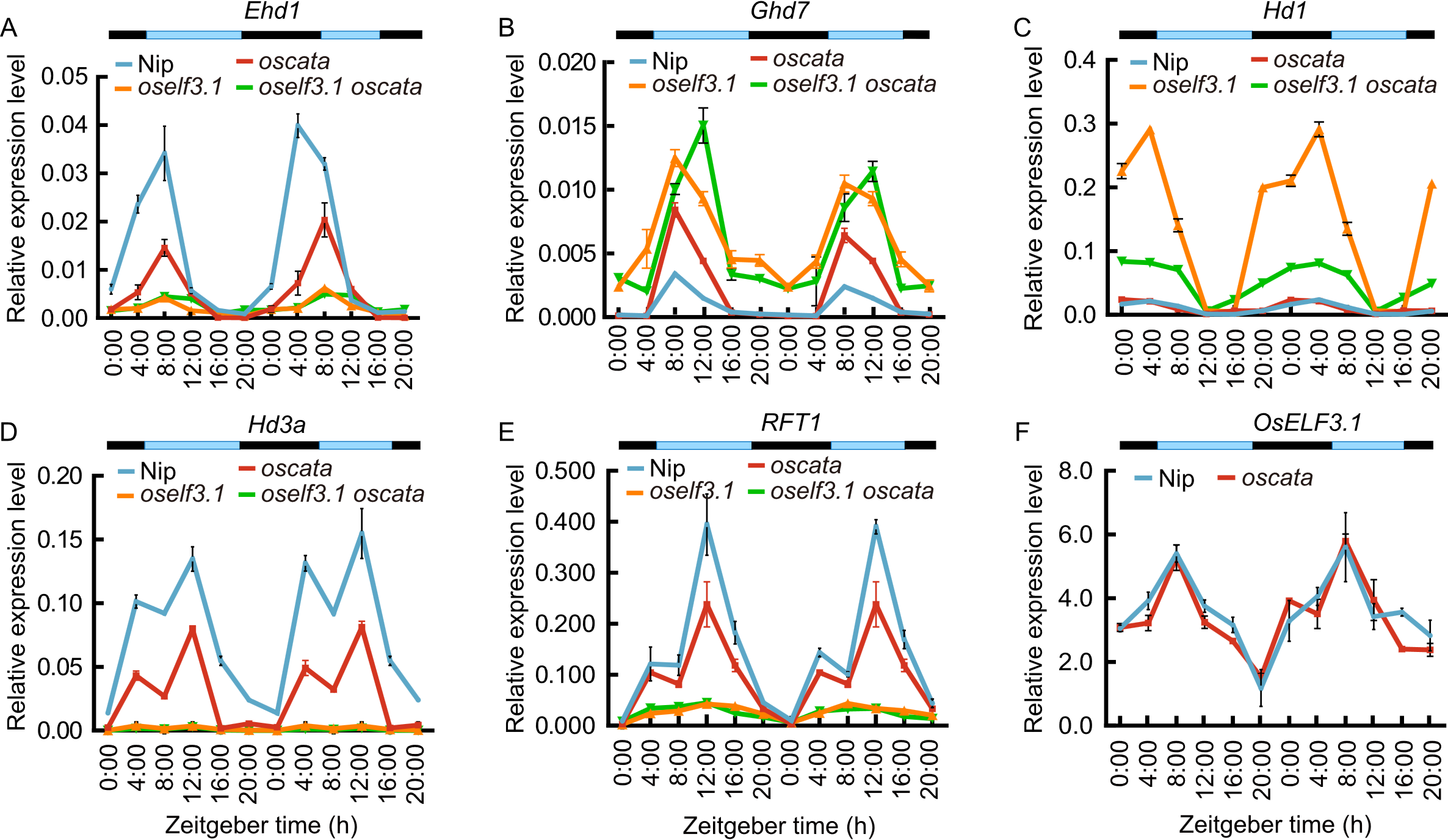 Fig. 5. Expression levels of genes related to heading date. qRT-PCR analyses of Ehd1 (A), Ghd7 (B), Hd1 (C), Hd3a (D), and RFT1 (E) in leaves of Nipponbare (Nip), oself3.1, oscata, and oself3.1 oscata double mutants, and OsELF3.1 (F) in Nip and oscata plants at 50 d after sowing under nature long-day conditions in Hangzhou filed. Data were normalized to ubiquitin (Os03g0234350) and represent mean ± SD (n = 3). Blue and black bars indicate light and dark periods, respectively.
