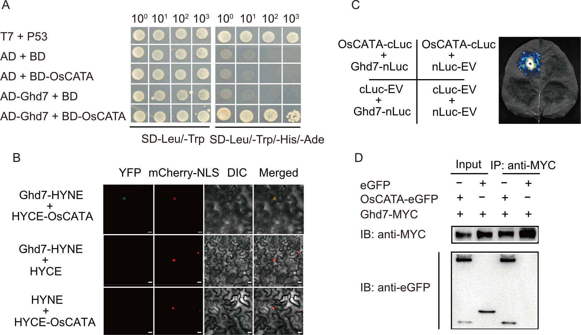 Fig. 6. OsCATA interacts with Ghd7. A, Yeast two-hybrid (Y2H) assays confirm interactions between OsCATA and Ghd7 using co-transformed Y2HGold yeast cells on DDO (SD-Leu/-Trp) and QDO (SD-Leu/-Trp/-His/-Ade) media. T7 and P53 serve as a positive interaction control pair; AD, GAL4 activation domain; BD, GAL4 DNA-binding domain. B, Bimolecular fluorescence complementation (BiFC) assays demonstrate OsCATA-Ghd7 interaction in rice protoplasts. Fluorescence signals were observed using a confocal microscope (Zeiss 980) 20-24 h after infiltration. mCherry-NLS was used as a nuclear marker. YFP, Yellow fluorescent protein; NLS, Nuclear localization signal; DIC, Differential interference contrast; HYNE, N-terminal half of YFP; HYCE, C-terminal half of YFP. Scale bars, 20 µm. C, Luminescence complementation imaging (LCI) assays validate the interaction between OsCATA and Ghd7 in Nicotiana benthamiana. Negative controls included nLuc and cLuc. Luminescence was captured using a Charge-Coupled Device camera at 3 d post-infiltration. cLuc, C-terminal fragment of luciferase; nLuc, N-terminal fragment of luciferase; EV, Empty vector. D, Co-immunoprecipitation (Co-IP) assays reveal interaction in protoplasts co-transfected with OsCATA-MYC and Ghd7-eGFP, detected with anti-MYC and anti-GFP antibodies. GFP, Green fluorescent protein; MYC, MYC epitope tag; IB, Immunoblot; IP, Immunoprecipitation.