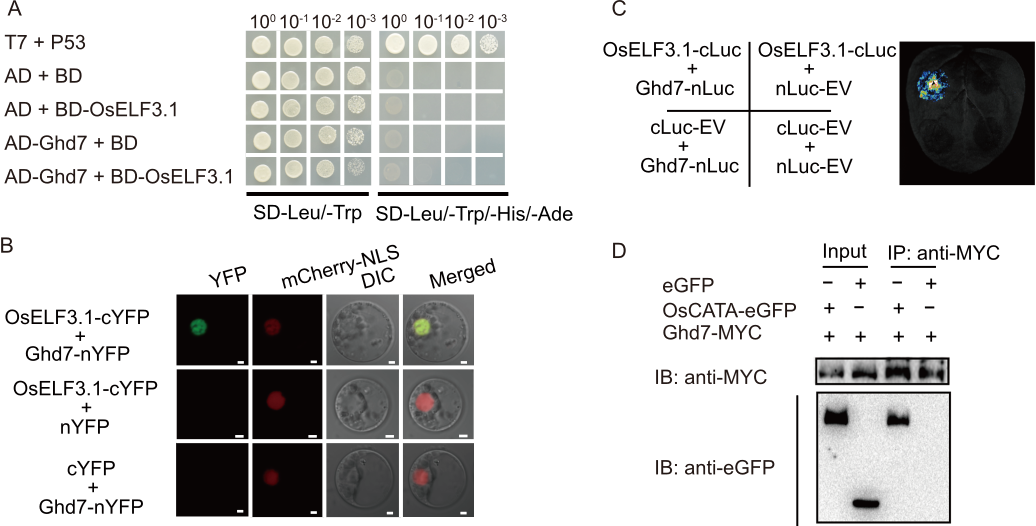Fig. 7. OsELF3.1 interacts with Ghd7. A, Yeast two-hybrid (Y2H) assays confirm OsELF3.1-Ghd7 interaction on DDO (SD-Leu/-Trp) and QDO (SD-Leu/-Trp/-His/-Ade) media. T7 and P53 serve as a positive interaction control pair; AD, GAL4 activation domain; BD, GAL4 DNA-binding domain. B, Bimolecular fluorescence complementation (BiFC) assays illustrate OsELF3.1-Ghd7 interaction in rice protoplasts, with fluorescence detected 20-24 h after infiltration using a confocal microscope (Zeiss 980). mCherry-NLS was used as a nuclear marker. cYFP, C-terminal fragment of yellow fluorescent protein; nYFP, N-terminal fragment of yellow fluorescent protein; Scale bars, 20 µm. C, Luminescence complementation imaging (LCI) assays verify the interaction of OsELF3.1 and Ghd7 in Nicotiana benthamiana. Luminescence was captured using a Charge-Coupled Device camera. cLuc, C-terminal fragment of luciferase; nLuc, N-terminal fragment of luciferase; EV, Empty vector. D, Co-immunoprecipitation (Co-IP) assays confirm the interaction in rice protoplasts co-transfected with OsELF3.1-MYC and Ghd7-eGFP. The proteins from crude lysates (upper, input) and the immunoprecipitated proteins (lower) were detected with anti-GFP and anti-MYC antibodies. GFP, Green fluorescent protein; MYC, MYC epitope tag; IB, Immunoblot; IP, Immunoprecipitation.