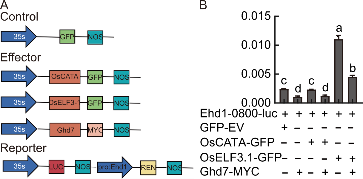 Fig. 8. Transcriptional activity assays. A, Illustration of constructs used in transcriptional activity assays. B, Relative LUC activity was measured in rice protoplasts with combinations of OsCATA, OsELF3.1, Ghd7, and the Ehd1 reporter. LUC and REN served as internal controls. Data are mean ± SD (n = 3). Different lowercase letters above bars indicate significant differences (P < 0.05) based on Duncan’s multiple range test. GFP, Green fluorescent protein; NOS, Nopaline synthase terminator; MYC, MYC epitope tag; LUC, Luciferase; REN, Renilla; EV, Empty vector.