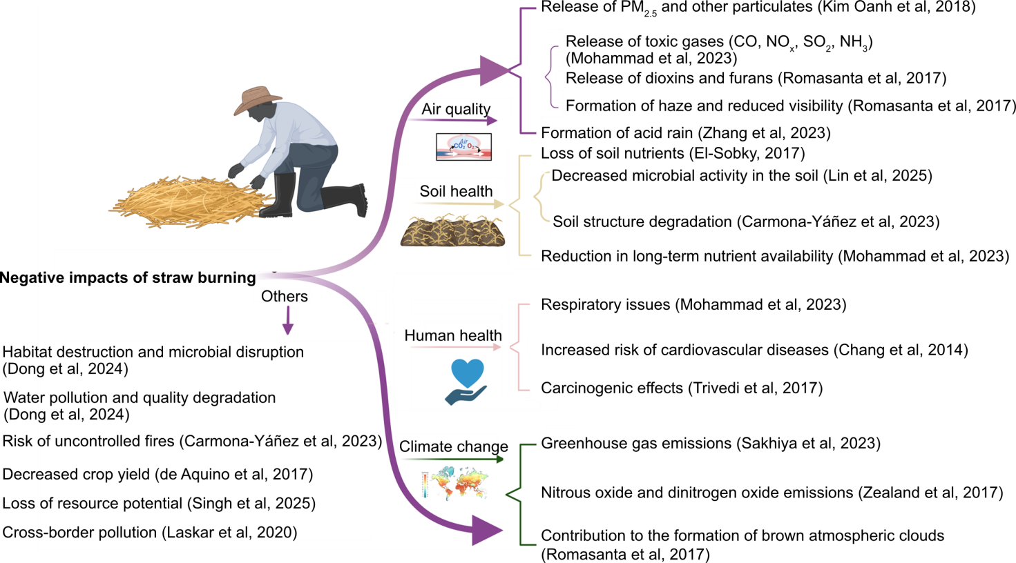 Fig. 1. Mind map of negative impacts of straw burning. The multidimensional negative impacts of straw burning across environmental, agronomic, health, and socio-economic domains. The figure visualizes how straw burning releases multiple atmospheric pollutants, including particulate matter (PM2.5, PM10) (Kim Oanh et al, 2018), carbon monoxide (CO), nitrogen oxides (NOx), sulfur dioxide (SO2), dioxins, and furans (Romasanta et al, 2017; Mohammad et al, 2023), leading to air quality deterioration, smog formation, and transboundary haze (Romasanta et al, 2017). These emissions exacerbate climate change through elevated greenhouse gas (CO2, CH4, N2O) concentrations and contribute to acid rain, soil acidification, and ecosystem degradation (Romasanta et al, 2017; Zealand et al, 2017; Sakhiya et al, 2023; Zhang et al, 2023). The mind map further illustrates agronomic impacts: burning depletes soil organic carbon, reduces microbial biomass and diversity, disrupts nutrient cycles, and accelerates erosion, undermining long-term soil fertility and agricultural productivity (El-Sobky, 2017; Mohammad et al, 2023; Carmona-Yáñez et al, 2023; Lin et al, 2025). Health consequences are highlighted through increased risks of respiratory diseases, cardiovascular conditions, neurotoxicity, and mortality, particularly among vulnerable populations (Chang et al, 2014; Trivedi et al, 2017; Mohammad et al, 2023). Socioeconomic dimensions include healthcare burdens, productivity losses, biodiversity threats, and broader costs from environmental degradation and resource loss (de Aquino et al, 2017; Laskar et al, 2020; Carmona-Yáñez et al, 2023; Dong et al, 2024; Singh et al, 2025).