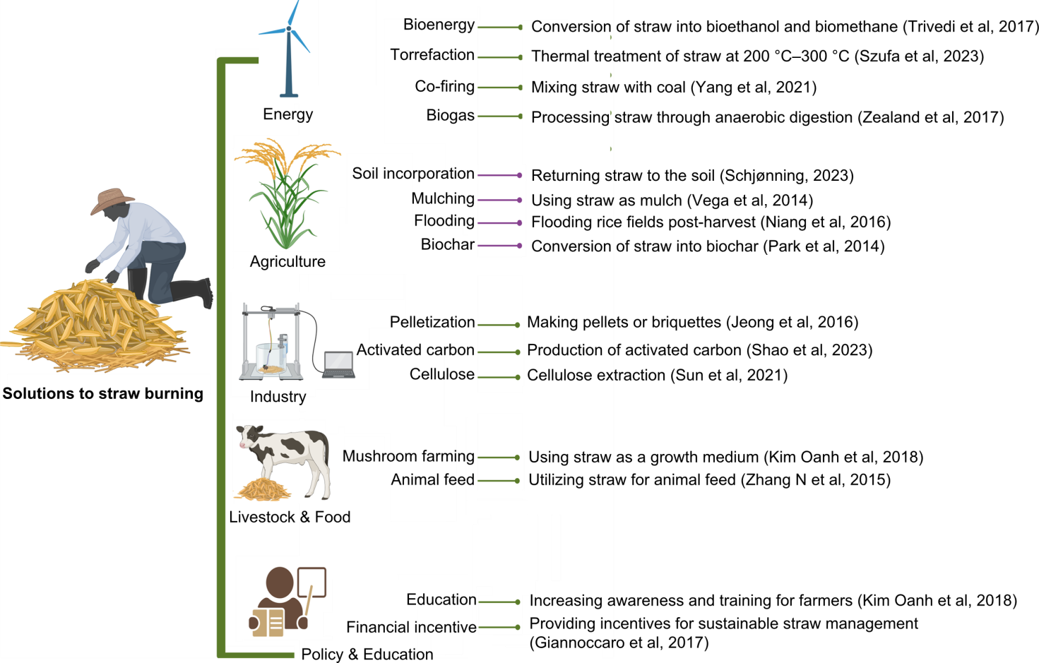 Fig. 2. Solutions to straw burning. The figure summarizes available solutions across technological, agronomic, industrial, and policy dimensions. The figure highlights energy valorization pathways such as bioenergy, biogas, torrefaction, and co-firing, which convert agricultural residues into renewable energy while reducing emissions (Trivedi et al, 2017; Zealand et al, 2017; Yang et al, 2021; Szufa et al, 2023). It also shows agricultural solutions like soil incorporation, mulching, biochar production, and post-harvest field management, which improve soil health and reduce the need for burning (Park et al, 2014; Vega et al, 2014; Niang et al, 2016; Schjønning, 2023). Industrial applications, including pelletization, activated carbon production, and cellulose extraction, offer high-value uses for straw, adding economic incentives (Jeong et al, 2016; Sun et al, 2021; Shao et al, 2023). Furthermore, the figure shows the livestock and food solutions in term of mushroom farming by using straw as a growth medium, and utilizing straw for animal feed (Zhang N et al, 2015; Kim Oanh et al, 2018). Additionally, the figure emphasizes the critical role of enabling policies, financial incentives, and educational programs to promote the adoption of sustainable practices (Giannoccaro et al, 2017; Kim Oanh et al, 2018).