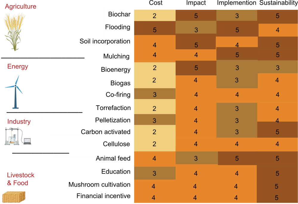 Fig. 3. Multidimensional analysis of straw management solutions. Multidimensional analysis of straw management solutions, evaluating 15 options across four key dimensions: sustainability, implementation feasibility, cost efficiency, and impact. The figure shows that agricultural solutions like soil incorporation and mulching achieve the best overall balance, combining high sustainability, ease of implementation, and cost efficiency. High-tech options such as bioenergy and biochar deliver strong environmental benefits but face higher costs and complexity. Scale description: Cost (1‒5): 1, Very expensive; 5, Very cheap. Impact (1‒5): 1, Minimum impact; 5, Maximum impact. Implementation (1‒5): 1, Very difficult to implement; 5, Very easy to implement. Sustainability (1‒5): 1, Highly unsustainable; 5, Highly sustainable.