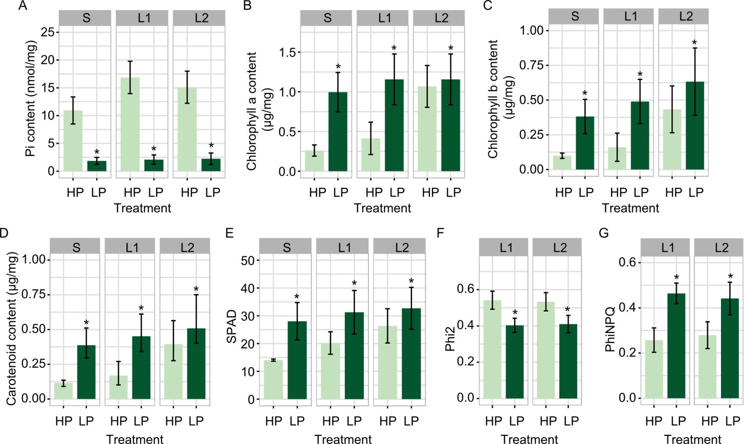 Fig. 2. Effect of phosphorus (P) deficiency on photosynthetic pigment content and photosynthesis of KDML 105 rice at the tillering stage. A-G, Contents of inorganic phosphate (Pi, A), photosynthetic pigments [chlorophyll a (B), chlorophyll b (C), and carotenoids (D)], and SPAD (Soil plant analysis development) value (E) were assessed in shoot (S), and the first (L1) and second (L2) fully expanded leaves, and photosynthetic parameters [the quantum yield of photosystem II (Phi2, F) and non-photochemical quenching (PhiNPQ, G)] were determined in L1 and L2 of 6-week-old KDML105 rice seedlings grown in pots under high (HP) and low P (LP) conditions. Data are mean ± SD (n = 3). * represents significant differences at the 0.05 level between the HP and LP treatments using the Student’s t-test.