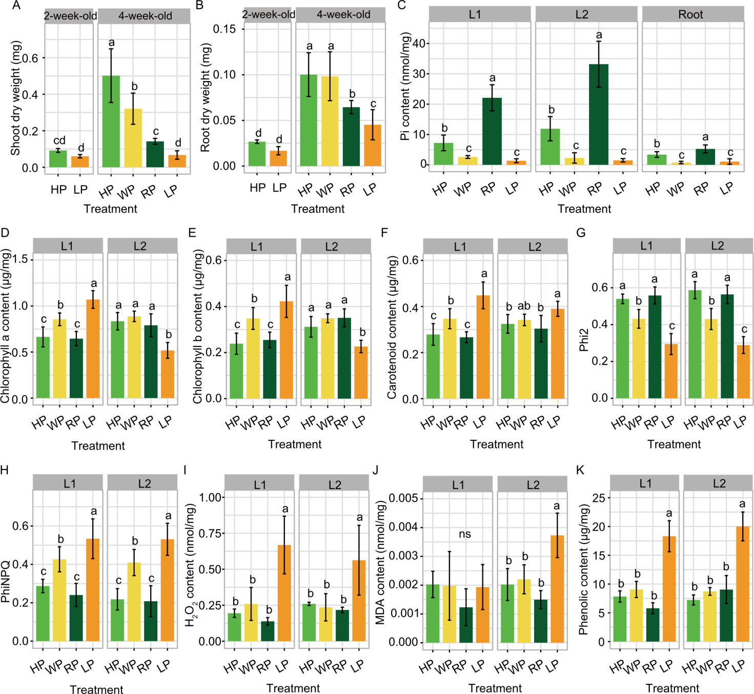 Fig. 3. Effects of various phosphorus (P) conditions on photosynthetic pigment content, photosynthetic parameters, and oxidative stresses in KDML 105 rice seedlings. A and B, Shoot dry weights (A) and root dry weights (B) were recorded in 2-week-old and 4-week-old seedlings. C, Inorganic phosphate (Pi) contents in the first (L1) and second (L2) fully expanded leaves and roots of rice seedlings. D-K, Photosynthetic pigments [chlorophyll a (D), chlorophyll b (E), and carotenoids (F)], photosynthetic parameters [the quantum yield of photosystem II (Phi2, G) and non-photochemical quenching (PhiNPQ, H)], and oxidative stresses [H2O2 (I), malondialdehyde (MDA, J), and phenolic (K) contents] were measured in L1 and L2 leaves of rice seedlings grown under hydroponic conditions for 4 weeks. Rice seedlings were subjected to the high P (HP), withdrawn P (WP), resupplied P (RP), and low P (LP) conditions. Data are mean ± SD (n = 3). Different lowercase letters above bars indicate significant differences among the treatments in each leaf age or root by one-way analysis of variance, with the Least Significant Difference test.