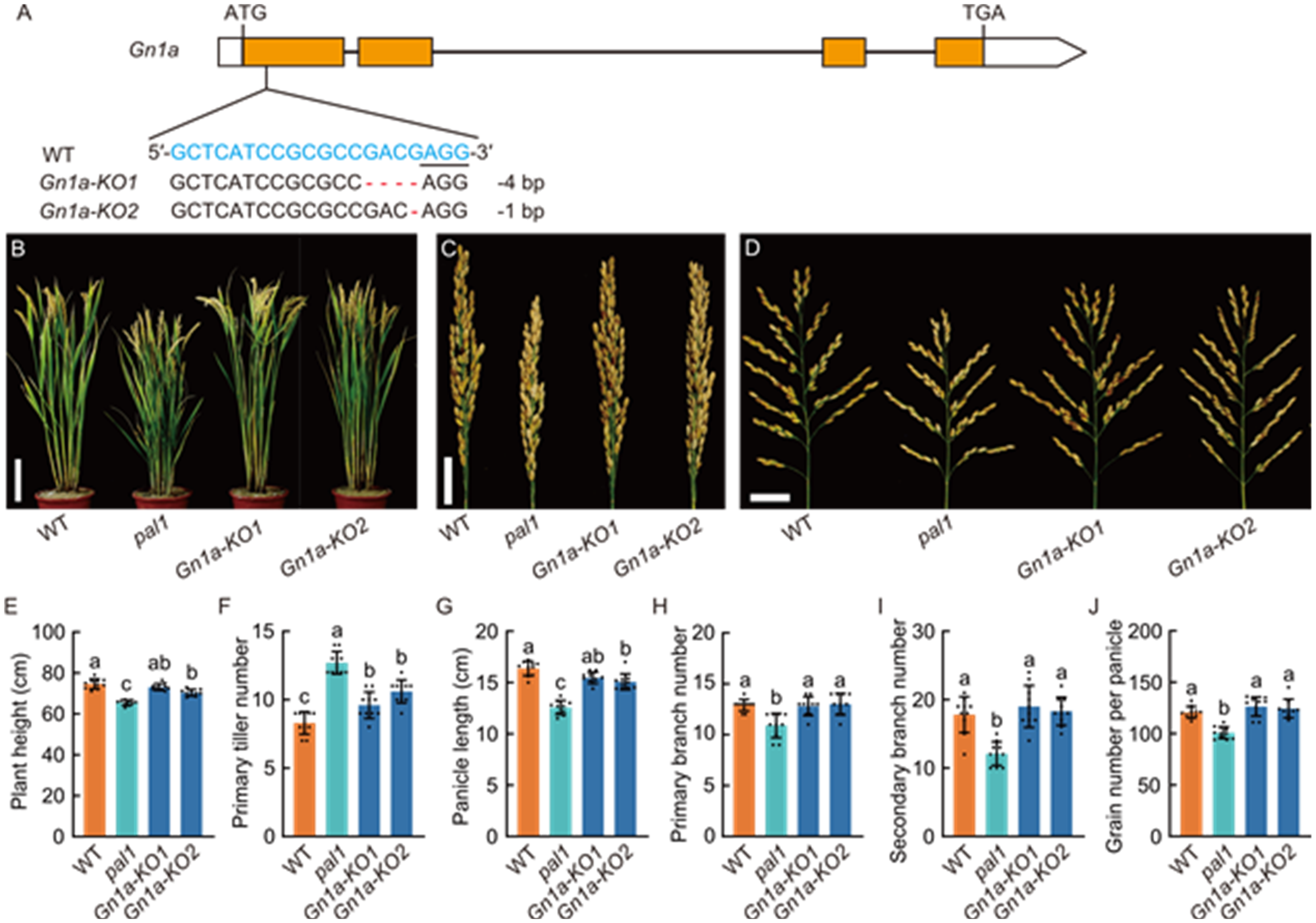 Fig. 3. Knocking out Gn1a in pal1 mutant (pal1 gn1a-ko1 and pal1 gn1a-ko2) using CRISPR/Cas9 system. A, Schematic representation of Gn1a target site and target sequence alignment of wild type (WT, Huaidao 5) and knockout (KO) lines (Gnla-KO1 and Gnla-KO2). The guide RNA target sequence is shown in blue, and the protospacer adjacent motif (PAM) sequence is underlined. Two mutations generated by CRISPR/Cas9 are shown in the lower panel. The start codon (ATG) and stop codon (TGA) are indicated. B, Morphology of mature plants of WT, pal1, and two homozygous KO lines. Scale bar, 15 cm. C and D, Morphology of closed (C) and spread (D) panicles generated on the primary tillers of WT, pal1, and two homozygous KO lines. Scale bars, 3 cm. E-J, Comparison of plant height (E), primary tiller number (F), panicle length (G), primary branch number (H), secondary branch number (I), and grain number per panicle (J) among WT, pal1, and two homozygous KO lines. Panicles in (G) to (J) only include those generated on primary tillers. Data are mean ± SD (n = 10). Different lowercase letters above histograms indicate significant differences at the 0.05 level by one-way ANOVA followed by Tukey’s multiple comparison test.