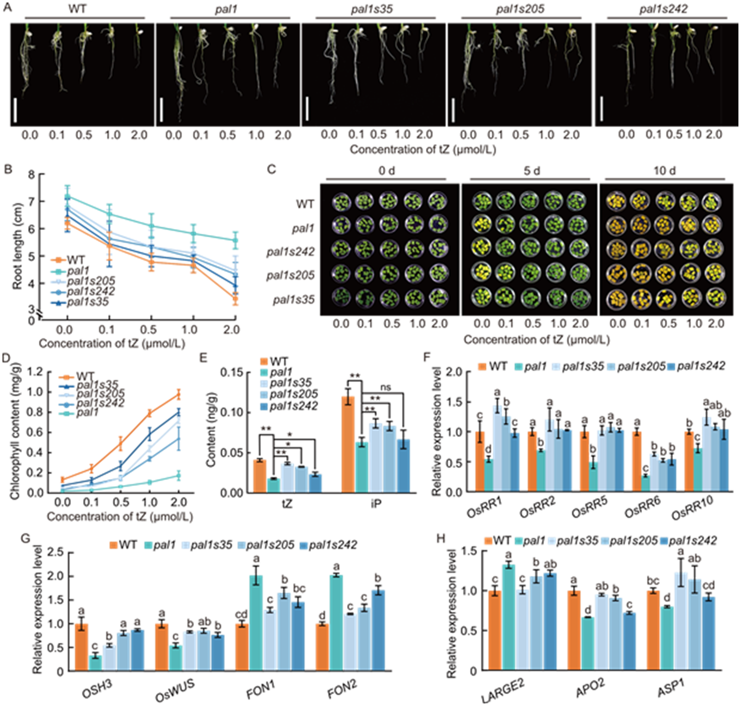 Fig. 4. Increased endogenous cytokinin levels and responsiveness in pal1 suppressor mutants pal1s35, pal1s205, and pal1s242. A, Seedling roots of wild type (WT), pal1, and pal1 suppressor mutants treated with various concentrations of trans-zeatin (tZ). Scale bars, 2 cm. B, Comparison of root length in WT, pal1, and pal1 suppressor mutants after 10 d of treatment with various concentrations of tZ. C, Effect of different concentrations of tZ on dark-induced leaf senescence in WT, pal1, and pal1 suppressor mutants. D, Quantification of chlorophyll content in leaves of WT, pal1, and pal1 suppressor mutants on 10 d of dark treatment. E, Comparison of cytokinin (tZ and isopentenyladenine) contents in young panicles (~0.5 cm) of WT, pal1, and pal1 suppressor mutants. F, Relative expression levels of type-A OsRRs genes in young panicles (~0.5 cm) of WT, pal1, and pal1 suppressor mutants. The rice Ubiquitin gene (LOC_Os03g13170) served as an internal control. G and H, Relative expression levels of genes related to meristem maintenance (G) and panicle development (H) in young panicles (~0.5 cm) of WT, pal1, and pal1 suppressor mutants. The rice Ubiquitin gene (LOC_Os03g13170) served as an internal control. In E-H, data are mean ± SD (n = 3). In E, ns, *, and ** indicate P > 0.05, P < 0.05, and P < 0.01, respectively, by Student’s t-test. In F-H, different lowercase letters above the bars indicate significant differences at the 0.05 level by one-way ANOVA followed by Tukey’s multiple comparison test.
