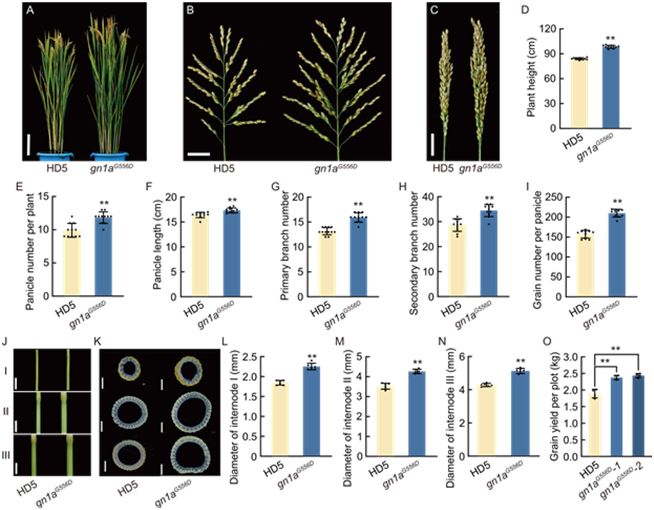 Fig. 6. Improvement of agronomic traits of Huaidao 5 by pal1 suppressor mutation. A, Morphology of mature plants of Huaidao 5 (HD5) and gn1aG556D. Scale bar, 15 cm. B and C, Morphologies of spread (B) and closed (C) panicles from the primary tillers of HD5 and gn1aG556D lines. Scale bars, 3 cm. D-I, Comparison of plant height (D), panicle number per plant (E), panicle length (F), primary branch number (G), secondary branch number (H), and grain number per panicle (I) between WT and gn1aG556D lines. Panicles in (D) to (I) include only those from primary tillers. J and K, Front views (J) and cross-sections (K) of the first (I), second (II), and third (III) internodes of HD5 and gn1aG556D. Scale bars, 1 cm in (J) and 1 mm in (K). L-N, Comparison of the diameters of first (internode I, L), second (internode II, M), and third (internode III, N) internodes between HD5 and gn1aG556D. O, Grain yield per plot (1.5 m2) of HD5 and gn1aG556D lines in the field. In D-I and L-O, data are mean ± SD (n = 10). **, P < 0.01 by Student’s t-test.