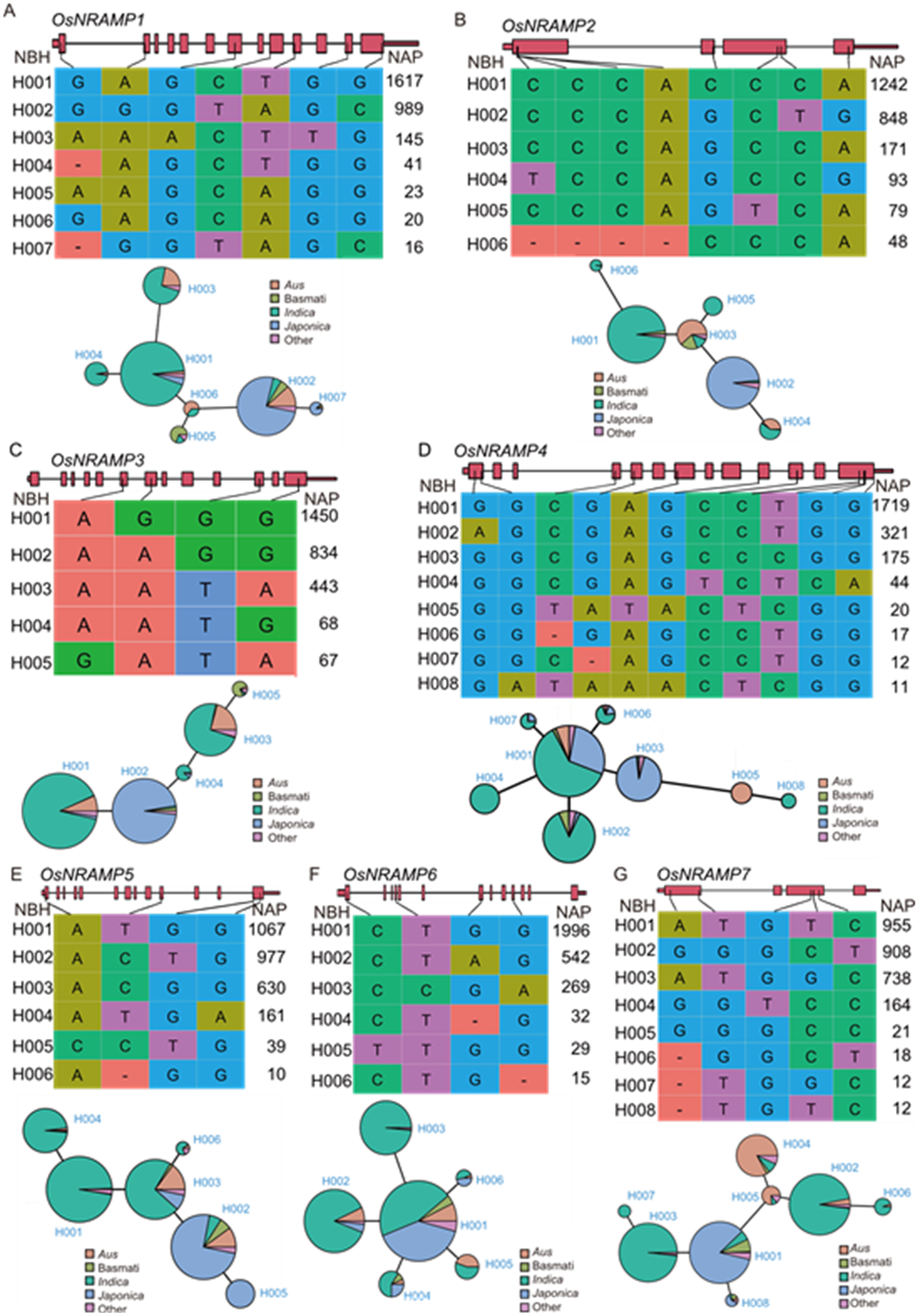 Fig. 2. Haplotype analysis of OsNRAMP1‒7 across 3K Rice Genome (RG) panel. A, OsNRAMP1, a key gene involved in multi-ion transport, exhibits seven haplotypes in the 3K RG panel, showing extensive phenotypic variation. B, E, and F, OsNRAMP2, OsNRAMP5, and OsNRAMP6, which are involved in iron (Fe) and manganese (Mn) metabolism, each display six haplotypes. C, OsNRAMP3, which facilitates Mn2+ translocation, has five haplotypes, with 1 450 accessions carrying the OsNRAMP3-H001 haplotype. D and G, OsNRAMP4 and OsNRAMP7 each show eight haplotypes. NBH, Nucleotide-based haplotype; NAP, Number of accessions in the 3K RG panel. ‘-’ indicates a base deletion.