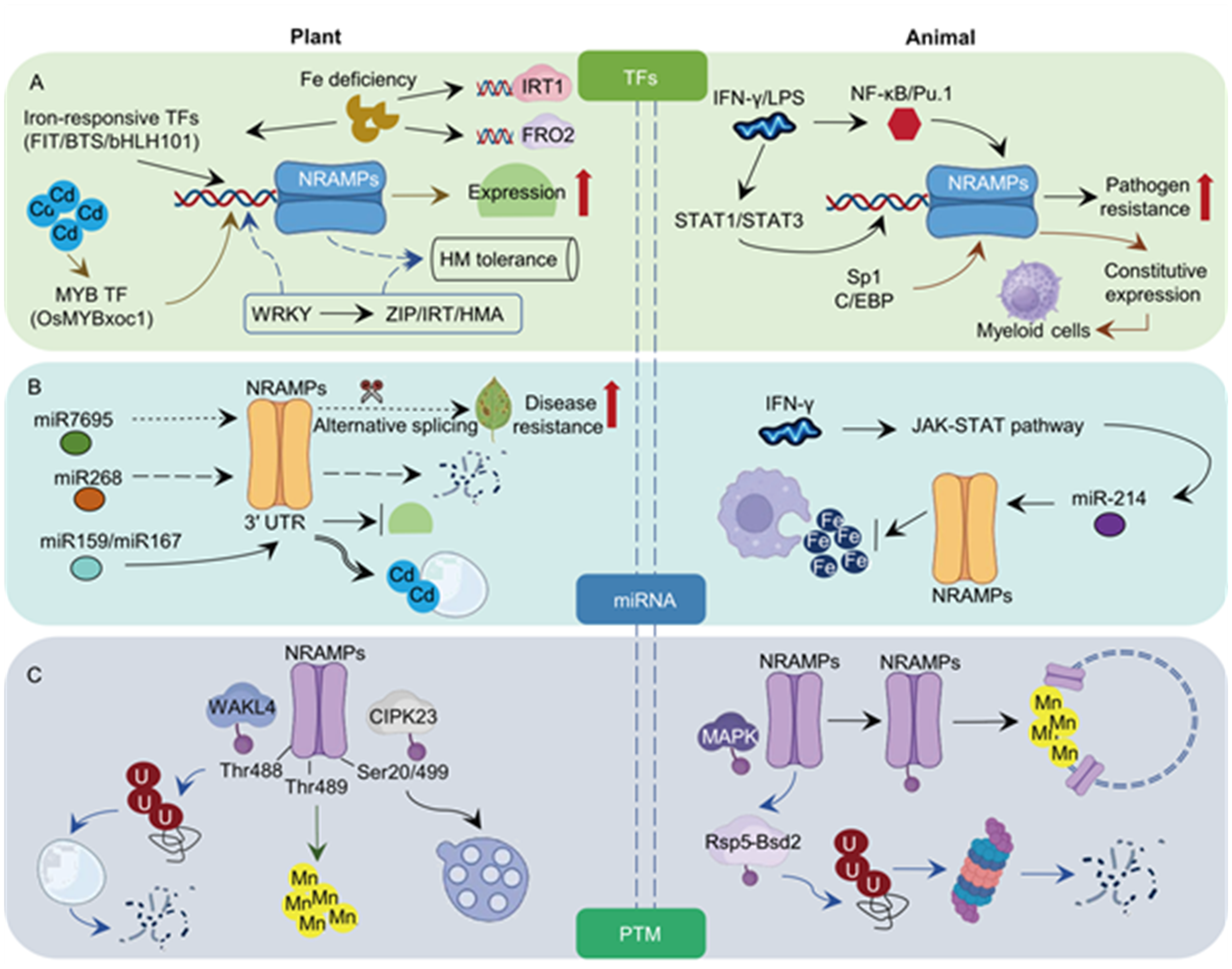 Fig. 4. Comparative regulatory networks of NRAMP transporters in plants and animals. A, Transcriptional regulation of NRAMPs. In plants (left), iron-responsive transcription factors (TFs) (FIT, BTS, bHLH101) and MYB TFs control NRAMP expression to balance metal uptake (Fe, Mn, Zn) and Cd detoxification. Interactions with other transporters (ZIP/IRT/HMA) further regulate metal homeostasis. In animals (right), pro-inflammatory signals (IFN-γ/LPS) activate myeloid-specific TFs (NF-κB, Pu.1, STAT1/3), inducing NRAMP1 (SLC11A1) expression and enhancing pathogen resistance. Basal expression is maintained by constitutive regulators (Sp1 and C/EBP). B, MicroRNA (miRNA)-mediated post-transcriptional control. In plants, Cd-induced miRNAs (e.g., osa-miR268, osa-miR7695) degrade OsNRAMP mRNAs or alter splicing, limiting Cd movement while preserving essential metals. In animals, immune-related miRNAs (e.g., miR-214) target a conserved sequence of NRAMPs, linking iron metabolism to antimicrobial defense. C, Post-translational modifications (PTMs). In plants, phosphorylation by WAKL4/CIPK23 modulates NRAMP stability and activity. In animals, MAPK-driven or Rsp5-Bsd2-mediated phosphorylation regulates NRAMP localization.
