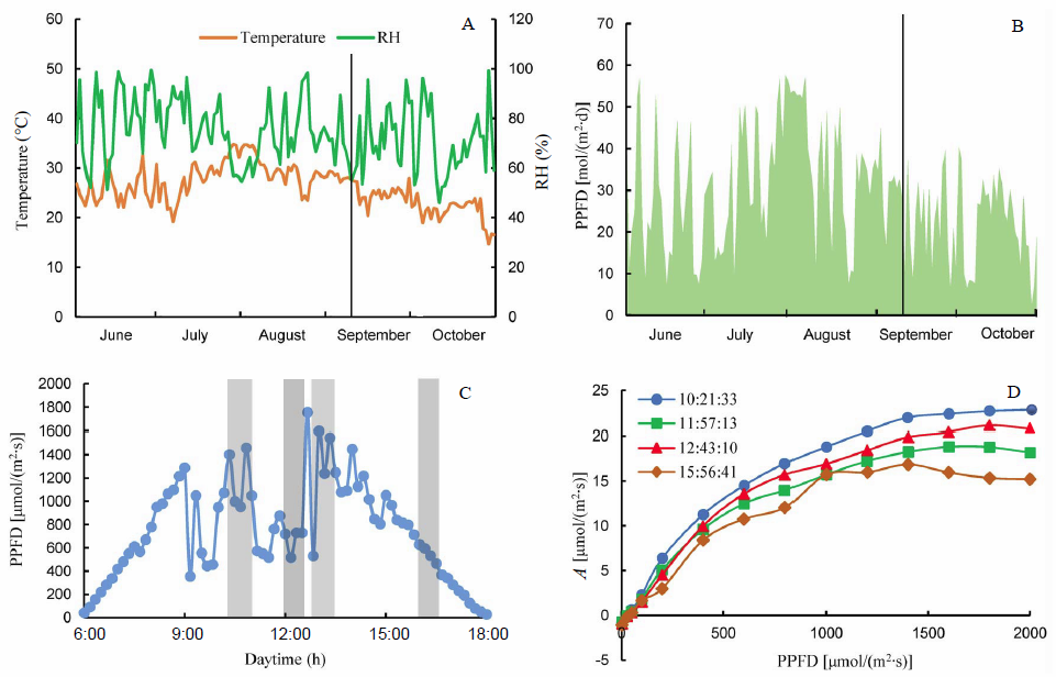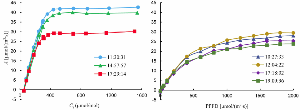 For A-Q curve measurements, we first set air flow rate being 500 μ mol/s, leaf chamber block temperature being 30 º C, reference CO2 concentration being 400 μ mol/mol and the initial light intensity being 2 000 μ mol/(m2∙ s), and kept leaves under such a condition for 20 min. Then we set a loop for changing through a series of light intensities, 2 000, 1 800, 1 600, 1 400, 1 200, 1 000, 800, 600, 400, 200, 100, 50, 25 and 0 μ mol/(m2∙ s) for 2 min before logging at each iteration. At last, we finished logging and set light intensity to 1 000 μ mol/(m2∙ s).