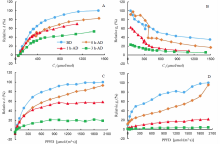 For A-Ci curve, we followed the method proposed by Gu et al (2010). To prevent over-fitting, we fixed dark respiration rate Rd to be 1 μ mol/(m2∙ s). Values of CO2 compensation point in the absence of dark respiration, Michaelis Menten constants (Ko and Kc) and temperature response function for these parameters were taken from Bernacchi et al (2001). A-Q curve was fitted with the classical non-rectangular hyperbola model: