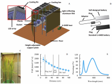 We designed a new indoor HAPS to deal with the dilemma (Fig. 3-A). HAPS consists of several independent modules, including light-emitting diodes (LED) arrays (45 cm × 45 cm × 10 cm), each of which contains 15 lines (parallel connection) and 15 rows (series connection) LEDs (XLamp XP-E2, CREE, USA), cooling fans (12 cm × 12 cm × 3 cm, ADN512XB-A9B, ADDA, Taiwan, China), decomposable steel support frames with height-adjustable support plates (100 cm × 50 cm × 200 cm) and walls covered with light-reflecting aluminum film (Metallic PET Film, STARLEAD, China). For each LED array, we used a programmable constant current power supply (RSP-750-48, Mean Well, Taiwan, China) to drive the LEDs and the radiator fans. The light intensity of artificial LED light source can be fine-tuned. The size of the facility is adjustable since HAPS can be easily assembled based on the independent modules mentioned above. The typical volume of the facility is 200 cm in length, 100 cm in width, and 200 cm in height (Fig. 3-A). During the measurement, we put the infrared gas analyzers (e.g. LI-6400) outside the frame to save space while the leaf chambers are placed on the adjustable support plates besides plants (not shown). We also designed a new high performance lithium battery, which, after it is fully charged, can support the operation of a LI-6400 for more than 7 h (Fig. 3-B). And the instrument is lighter and more useful when working for long time in the field. Plants posture in HAPS is shown in Fig. 3-C (notice that we removed the light- reflecting aluminum film to avoid dazzle light in the picture). Light intensity at different layers of plants and light spectrum are shown in Fig. 3-D and -E, respectively.