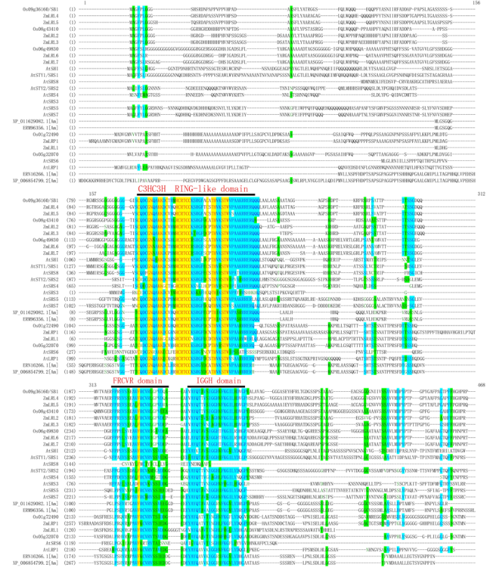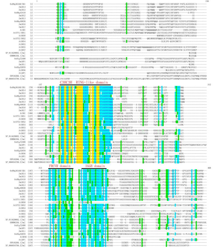 ... The LOC_Os01g724901 and LOC_Os05g320701 had high homology and close branching relationship with LRP, which was widely studied in Arabidopsis and maize (Fig. 3-A). Previous studies have shown that the sequences of the SHI/LRP/SRS family proteins were highly diverse, with highly conserved regions: a C3HC3H RING-like domain and an IGGH domain (Fridborg et al, 2001; Kuusk et al, 2002, 2010). Then, the protein motif prediction program MEME and protein sequence alignment program DNAMAN were used to analyze the full-length amino acid sequences of SHI/LRP/SRS family proteins in rice, maize and Arabidopsis. The result showed that there were three highly conservative domain/motifs: a RING-like structure domain, an IGGH domain and an FRCVR domain in the SHI/LRP/SRS family proteins. In previous results, the FRCVR domain was not identified separately (Figs. 3-B, S2 and S3). ...