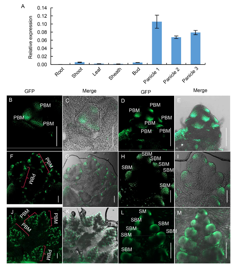 Fig. 4. Expression pattern of SB1. A, qPCR analysis of SB1 in root, shoot, leaf, sheath, tiller bud and panicles of different length. Panicles 1, 2 and 3 refer to panicles with the lengths of < 0.5, 0.5‒1.0 and 1.1‒2.0 cm, respectively. OsActin was used as a reference gene. Data are Mean ± SD (n = 3). B‒M, GFP signal indicating SB1 expression in complementary transgenic plants harboring the construct SB1P: SB1:GFP. B and C, Panicles at the stage In2; D and E, Panicles at the stage In3; F and G, Panicles at the stage In4; H and I were the magnification figure of a PBM in F and G; J and K, Panicles at the stage In5; L and M were the magnification figure of a PBM in J and K. PBM, Primary branch meristem; SBM, Secondary branch meristem; SM, Spikelet meristem. In2, 3, 4 and 5 refer to the four inflorescence stages of rice during which the branch meristems formed. Bars are 100 μm.