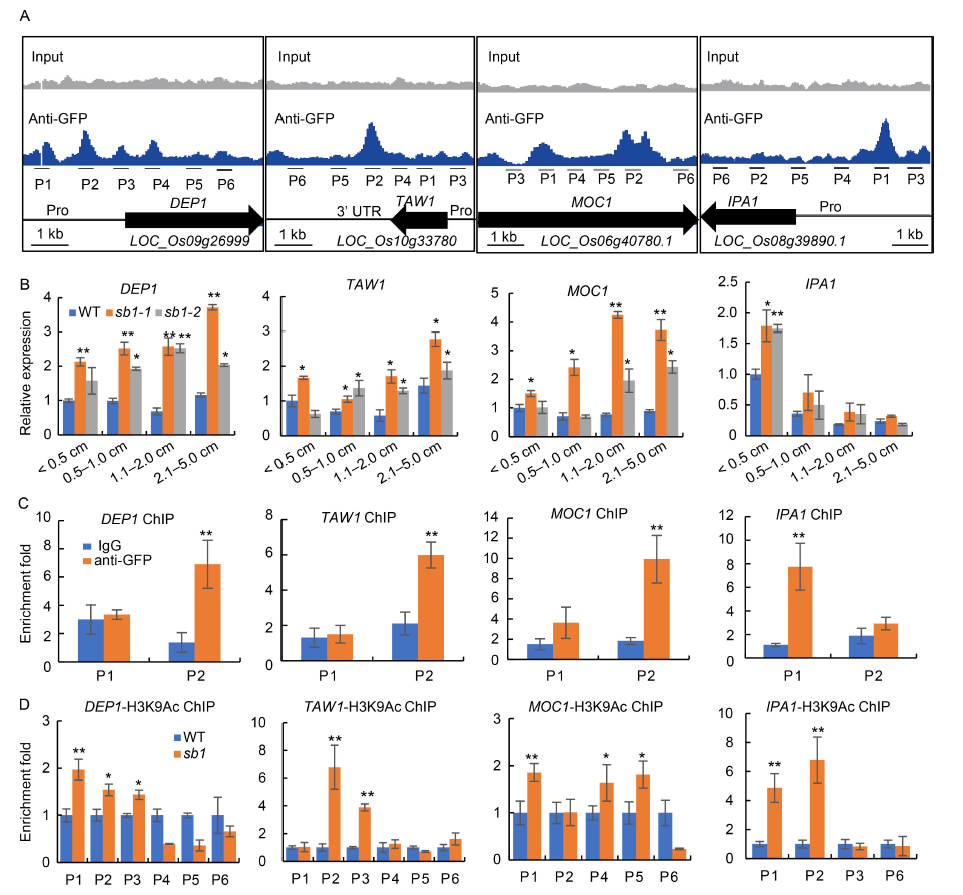 Fig. 6. SB1 directly repressed expression of DEP1, TAW1, MOC1 and IPA1. A, Binding peaks of SB1 with DEP1, TAW1, MOC1 and IPA1 by chromatin immunoprecipitation-sequence (ChIP-seq) using an anti-GFP antibody. B, Relative expression of DEP1, TAW1, MOC1 and IPA1 in the wild type (WT) and sb1 panicles, respectively. C, ChIP-qPCR for P1 and P2 sites of DEP1, TAW1, MOC1 and IPA1 with anti-GFP antibody, respectively. ChIP enrichment compared with the input sample was tested by qPCR. D, ChIP-qPCR for several sites of DEP1, TAW1, MOC1 and IPA1 with a H3K9Ac antibody, respectively. ChIP enrichment compared with the IgG sample was tested by qPCR. Pro, Promoter; P1 to P6 represent primers for ChIP-qPCR. Error bars indicated SD of three repeats. The Student’s t-test was used to generate the P values. *, P < 0.05; **, P < 0.01.