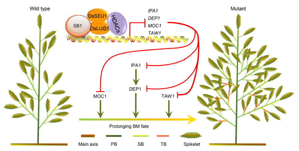 Fig. 7. Model of SB1 gene regulating rice panicle architecture. In the wild type plants, SB1 interacts with the corepressors OsSEU1 and OsLUG1 to form the repression complex and repress DEP1, TAW1, MOC1 and IPA1 by downregulating the acetylation levels of histone on chromosome. In the sb1-1/2/3/4/5 mutants, the repression complex cannot work, resulting in the increased acetylation levels and the expression levels of DEP1, TAW1, MOC1 and IPA1, which enables the formation of the increased numbers of branches and spikelets. HDACs, Histone deacetylases; BM, Branch meristem; PB, Primary branch; SB, Secondary branch; TB, Tertiary branch.