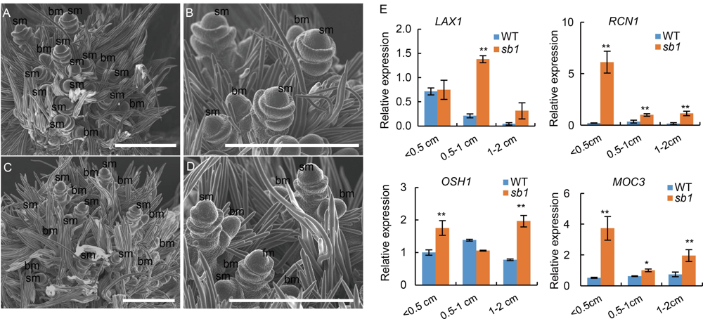 Fig. S1. scanning electron microscopy analysis of young panicles of sb1-1 mutant and wild type. A, Wild type panicles. B, Magnified figure of A. C, sb1-1 panicles. D, Magnified figure of C. E, Expression of LAX1, RCN1, OSH1 and MOC3. bm, branch meristem; sm, spikelet meristem. Bars are 500μm. Data are Mean ± SD (n = 3). The Student’s t-test was used to generate the P values. *, P < 0.05, **, P < 0.01.