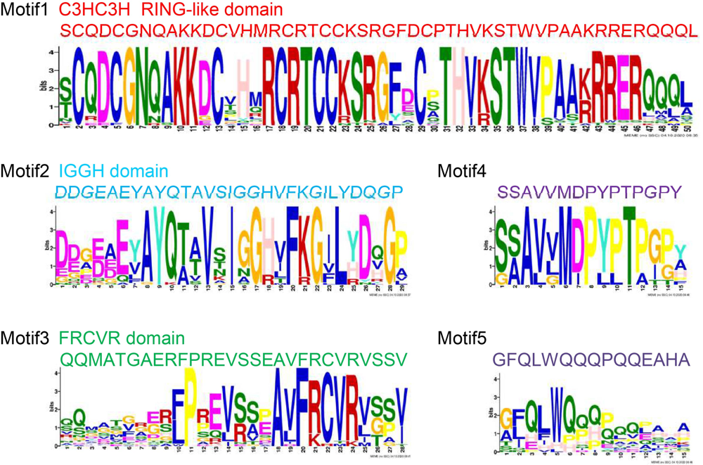 The LOC_Os01g724901 and LOC_Os05g320701 had high homology and close branching relationship with LRP, which was widely studied in Arabidopsis and maize (Fig. 3-A). Previous studies have shown that the sequences of the SHI/LRP/SRS family proteins were highly diverse, with highly conserved regions: a C3HC3H RING-like domain and an IGGH domain (Fridborg et al, 2001; Kuusk et al, 2002, 2010). Then, the protein motif prediction program MEME and protein sequence alignment program DNAMAN were used to analyze the full-length amino acid sequences of SHI/LRP/SRS family proteins in rice, maize and Arabidopsis. The result showed that there were three highly conservative domain/motifs: a RING-like structure domain, an IGGH domain and an FRCVR domain in the SHI/LRP/SRS family proteins. In previous results, the FRCVR domain was not identified separately (Figs. 3-B, S2 and S3).