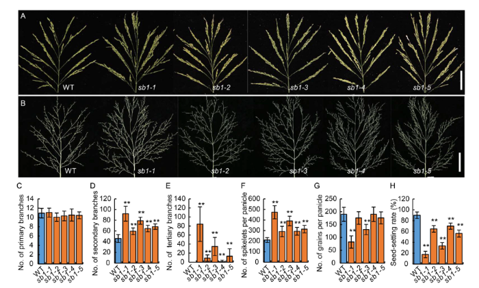 Fig. 1. Phenotypes of panicles in wild type (WT) and sb1-1/2/3/4/5 mutants. A, Panicles of the WT and sb1-1/2/3/4/5 mutants with spikelets on the branches. Bars are 5 cm. B, Panicles of the WT and sb1-1/2/3/4/5 mutants without spikelets on the branches. Bars are 5 cm. C‒H, Numbers of primary branches per panicle (C), numbers of secondary branches per panicle (D), numbers of tertiary branches per panicle (E), numbers of spikelets per panicle (F), numbers of grains per panicle (G) and seed-setting rates (H) of WT and sb1-1/2/3/4/5. The wild type plants and sb1-1/2/3/4/5 mutants were grown in standard paddy field under conventional cultivation conditions. Data are Mean ± SD (n = 10). The Student’s t-test was used to generate the P values. **, P < 0.01.