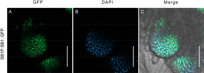 Fig. S4. Subcellular location of SB1 by observing the GFP signal in SB1P:SB1: GFP transgenic plants. A, GFP signals in cells of branch meristem. B, DAPI signal in nucleus. C, Merged fluorescence signal of GFP and DAPI. Bars are 50 μm.