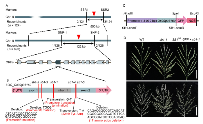 Fig. 2. Map-based cloning of SB1. A, Fine mapping of SB1 on chromosome 9. B, Structure of SB1 and mutation sites of sb1-1/2/3/4/5. C, Structure of the SB1-GFP fusion complementary vector. D, Phenotypes of the wild type, sb1-1 and sb1-1-GFP transgenic plant. Bars are 5 cm. ORF, Open reading frame; SB1-comF and SB1-comR, Cloning primers of SB1 for complementary test.