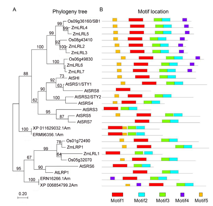 Fig. 3. SB1 encodes a RING-like zinc finger protein. A, Phylogenetic tree analysis. The phylogenetic tree was constructed using the neighbor- joining method based on the Jone-Taylor- Thornton matrix-based model, and bootstrap support values calculated from 1 000 replicates are given at the branch nodes. At, Arabidopisis thaliana; Os, Oryza sativa; Zm, Zea mays. B, Location of conserved domains of the genes in the phylogeny tree.