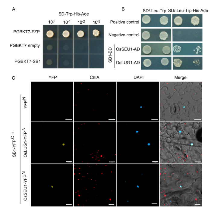 Fig. 5. Interaction of SB1 with corepressors of OsSEU1 and OsLUG1. A, Autoactivation analysis of SB1 protein. PGBKT7-FZP was used as a positive control and PGBKT7-empty as a negative control. B, SB1 interacted with OsSEU1 and OsLUG1 in yeast cells by a yeast two- hybrid assay. C, SB1 interacted with OsSEU1 and OsLUG1 in epidermal cells of Nicotiana benthamiana by a bimolecular fluorescent complimentary (BiFC) assay. YFP, Yellow fluorescent protein; ChlA, Chlorophyll A; DAPI, 4’,6-diamidino-2-phenylindole. Bars are 20 μm.